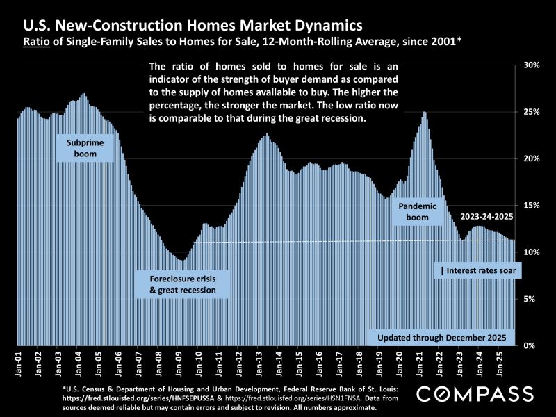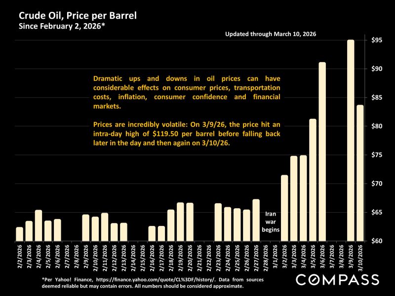 This year, the wild card is the possible effects the Iran war may have on inflation, interest rates, financial markets and consumer confidence 🌍. As of March 10th, there is substantial political/economic uncertainty ⚖️, but the situation may resolve itself relatively quickly, with little impact on housing markets 🏘️. For the time being, the oil price is gyrating ⛽ on 3/9/26 it ranged from $81/barrel to $119, stock markets are volatile 📉, inflation in February was subdued 📊, and mortgage interest rates remain near multi-year lows 🏦.