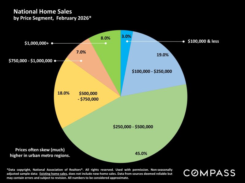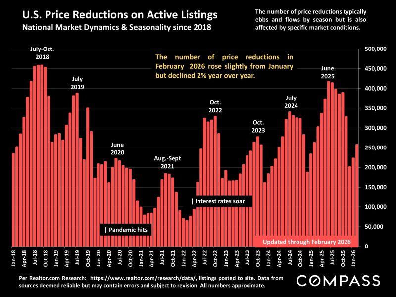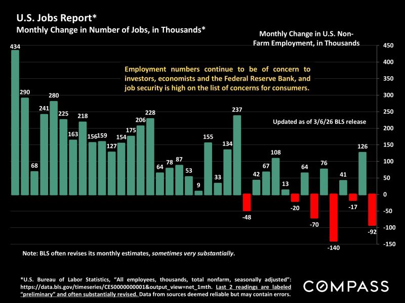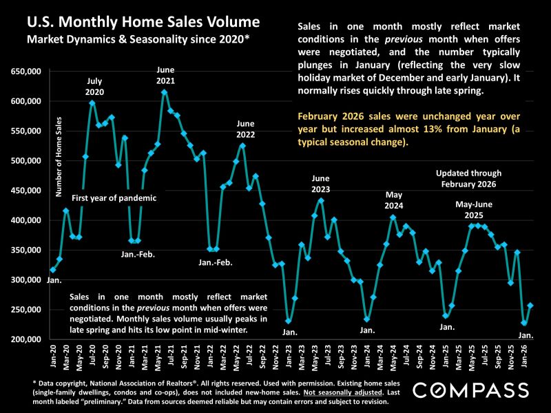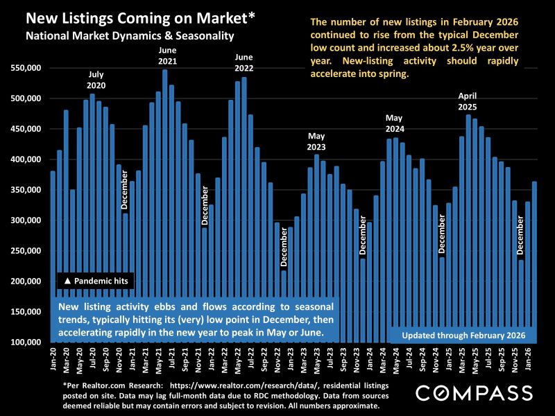 In most of the country, real estate markets were still waking up in February from the mid-winter lull ❄️ and often dealing with challenging weather conditions 🌬️. There were increases from January in the numbers of homes for sale and of listings going into contract 📋, but the more substantial rebound in new listings and buyer demand typically begins in March 🌷 and then accelerates moving deeper into spring 🌞. Last year, this dynamic was upended by April’s tariff shock 📉, which among other impacts caused the S&P 500 and Nasdaq to plunge over 12% in one week 📊, and the usual spring-market momentum was mostly lost.